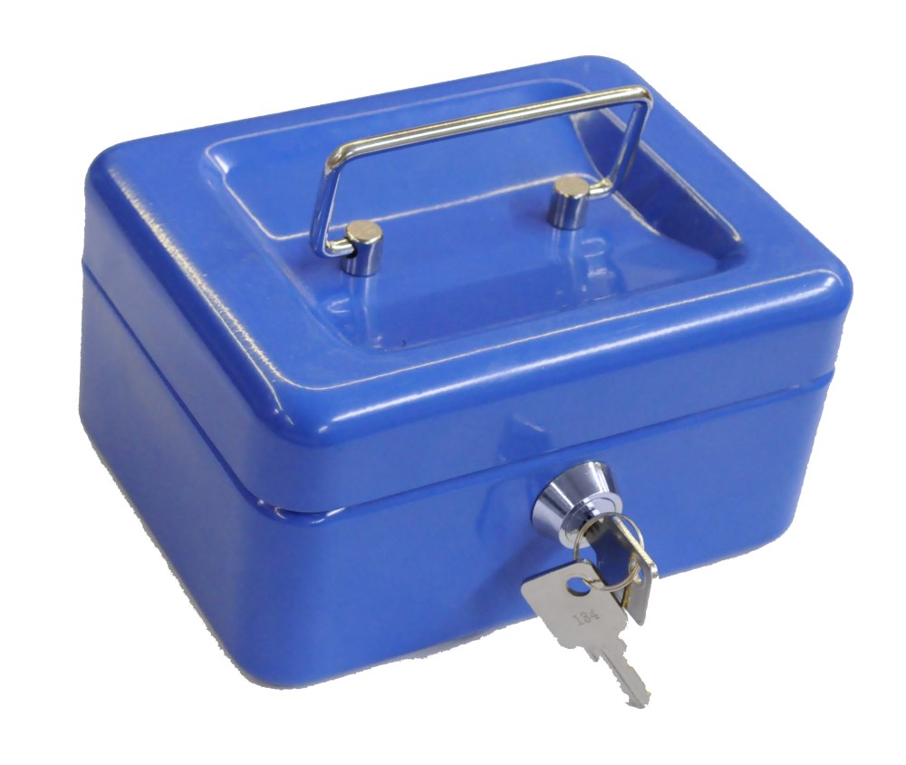 Small metal safe used by cashiers and small businesses to store monetary values or valuables also with a plastic holder for coins. Top opening with key. The dimensions of the safe are 80 x 150 x 115 mm.