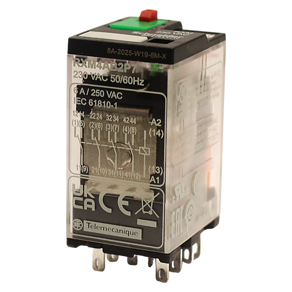 4C/O LED relay with 230VAC voltage, suitable for commanding electrical loads with safe and efficient control in electrical centers or automation equipment.