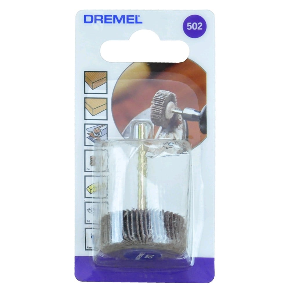 Flap wheel 28.6x9,5 mm grit 80 (502). Perfect for sanding flat or contoured surfaces on metal,wood, rubber or plastic.