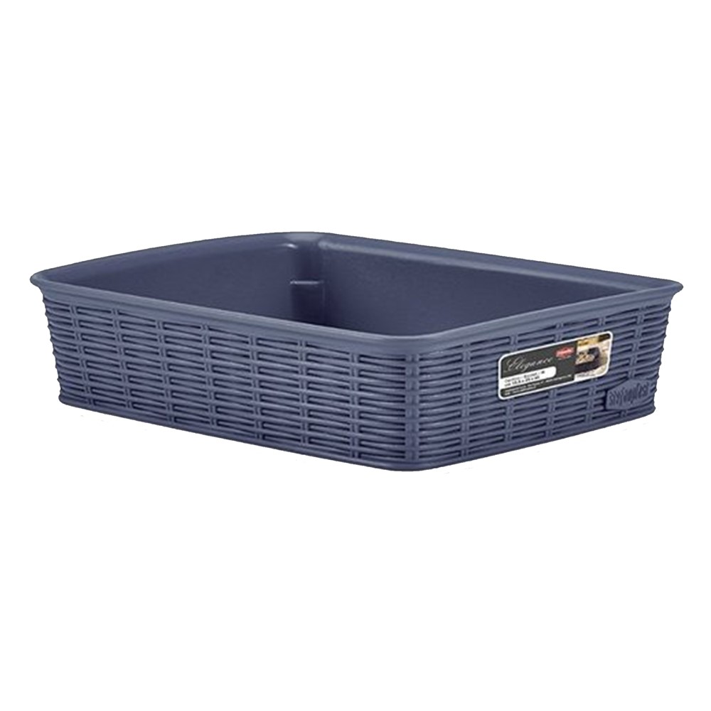 The rectangular basket from the Elegance line, in blue navy color and measuring 25x19.5xH6 cm fits in the bathroom, in the living room or in the kitchen. The basket is an excellent alternative to wicker baskets, which means it has a plastic material, to give the idea of knitting but with a simple and smooth structure. This modern design combined with utility values makes the basket fit perfectly into the arrangement of any interior space.