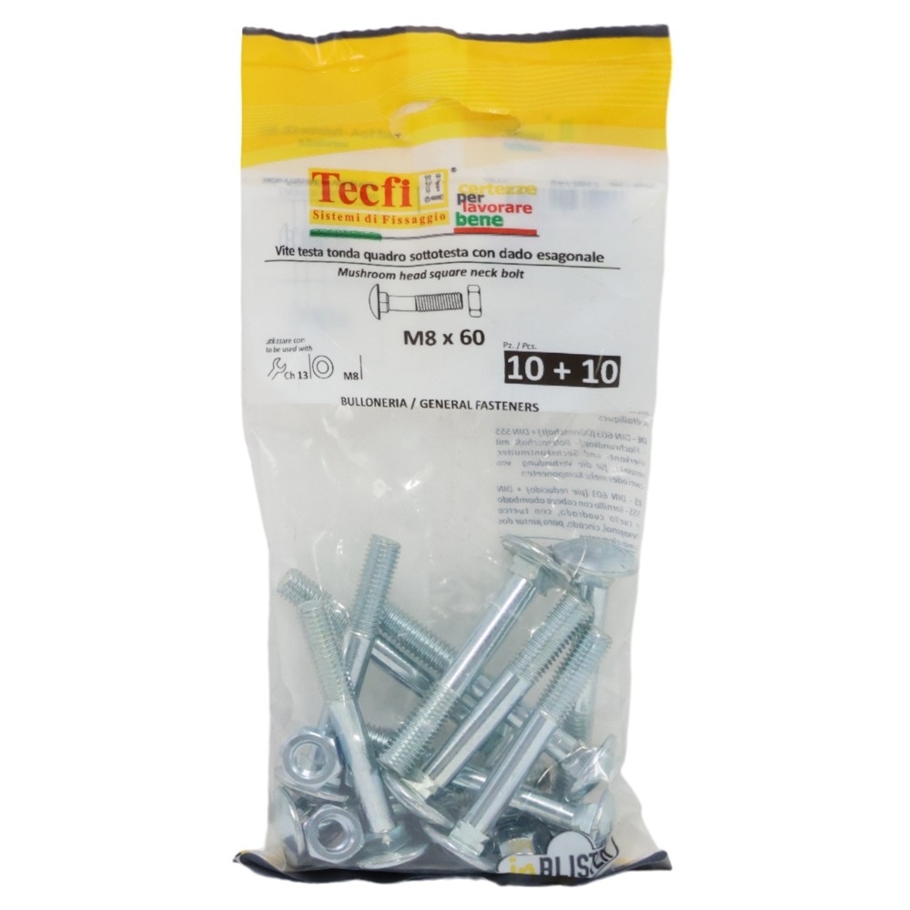Mushroom head square neck bolt w/hex nut, 4.8, zp, M8x60mm, Bag 10
