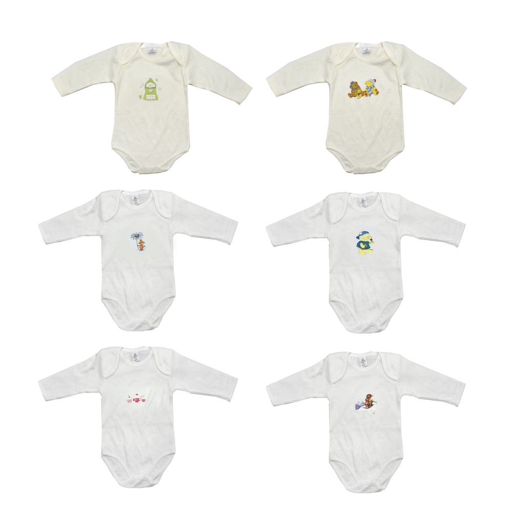 Long-sleeved infant bodysuit for newborn babies, made of soft cotton material, with antibacterial and hypoallergenic properties, which does not cause skin irritations, in white color with different designs. This product is suitable for babies up to 18 months old.