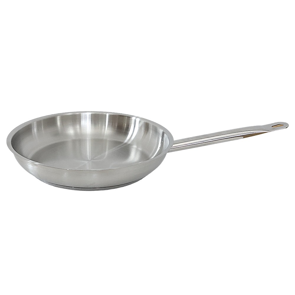 This pan is constructed with 18/10 stainless steel, a material known for its durability and corrosion resistance, ensuring quality even with frequent use.