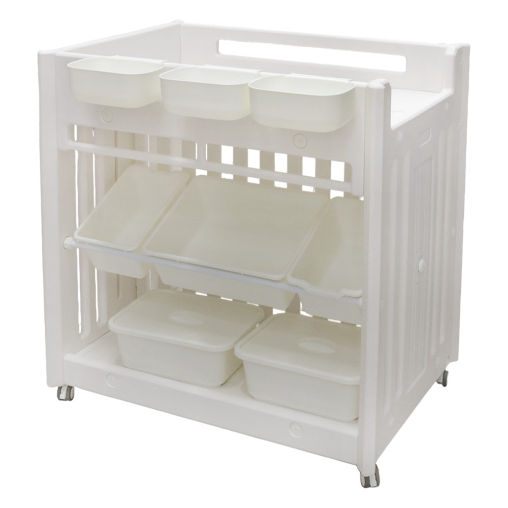 The organizer for children's room, made of plastic material and with wheels, has dimensions 89x66x92 cm and white color, is a practical and functional solution for storing and organizing the space in the child's room. This product offers a great opportunity to keep toys, clothes, books and other baby essentials organized and accessible. Constructed from strong and durable plastic, this organizer provides safe and reliable storage of baby items while being easy to clean.