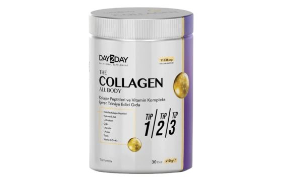 Day2Day The Collagen All Body is a food supplement in powdered form containing 9366,6 mg collagen peptide, glutathione, hyaluronic acid, vitamin and mineral complex.Recommended daily use dosage is 10 g (1 scoop) per day.10 g (1 scoop) of The Collagen All Body in your water or other foods and consume daily.