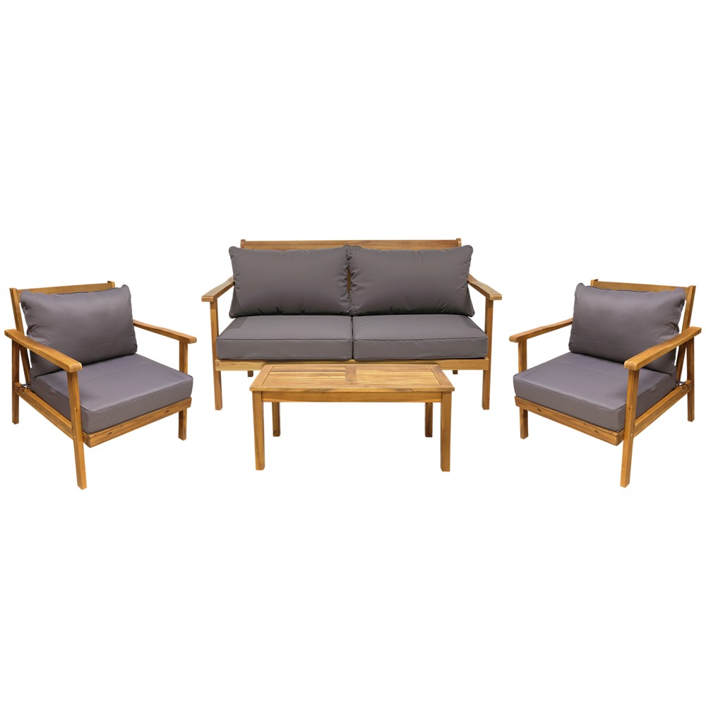 You're reviewing:Outdoor set, tropical Acacia wood, 2 single armchairs + 1 double armchair + table, 68x76xH65 cm 82x78.5xH83 cm, double 152x78.5xH65 cm, table 90x45xH42 cm
