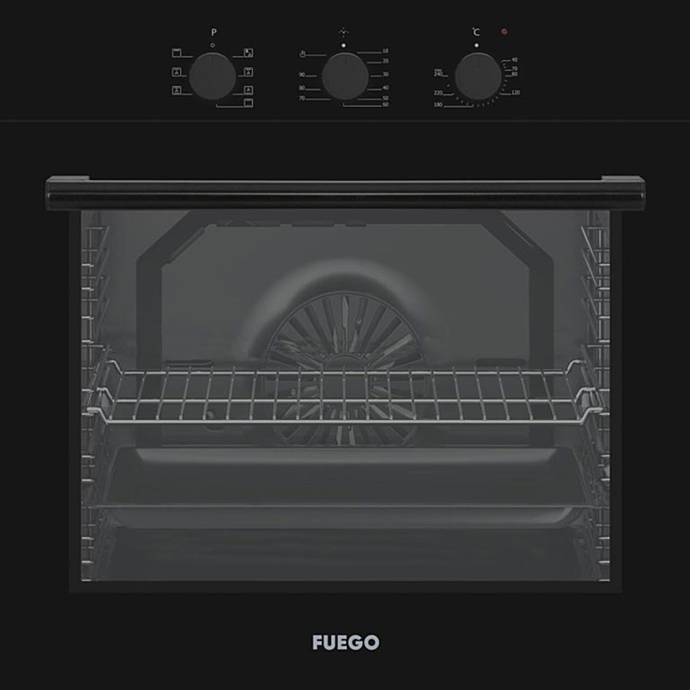 Built-in ovenFuego with capacity 80 Lt. Black enamel and black glass on the door. Black buttons. With a mechanical timer. 8 functions. Grill + fan. Energy class A