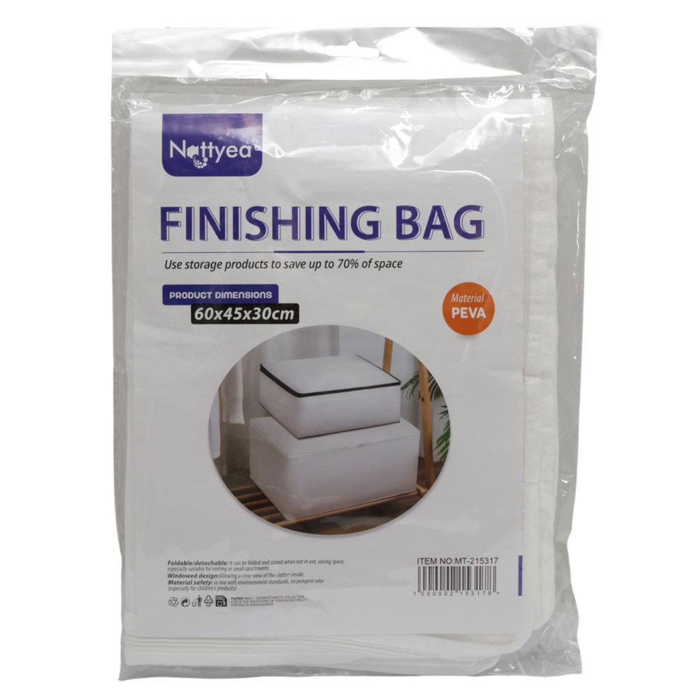 Storage bag made of durable polyester in white, with dimensions 60x45x30 cm. Ideal for storing and organizing clothes, pillows or various items in a clean and tidy way. The lightweight and resistant material makes this bag suitable for daily use and long term storage.