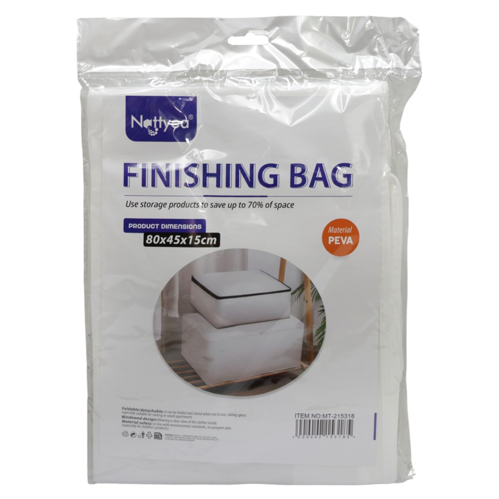 Storage bag made of durable polyester in white, with dimensions 80x45x15 cm. Ideal for storing and organizing clothes, pillows or various items in a clean and tidy way. The lightweight and resistant material makes this bag suitable for daily use and long term storage.