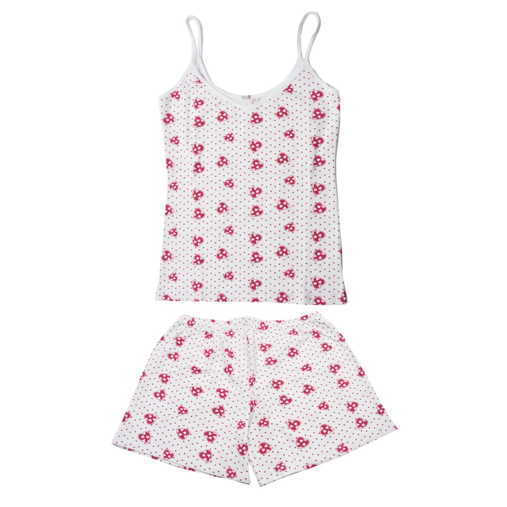 Summer pajamas for women, model Diana, which include a strappy top with a pair of shorts, in white with hearts, made of 70% polyester and 30% cotton material, with hypoallergenic and antibacterial properties, which does not cause skin irritation, absorbs excess moisture, is hygienic and has body temperature regulating properties. This product is suitable for daily use.