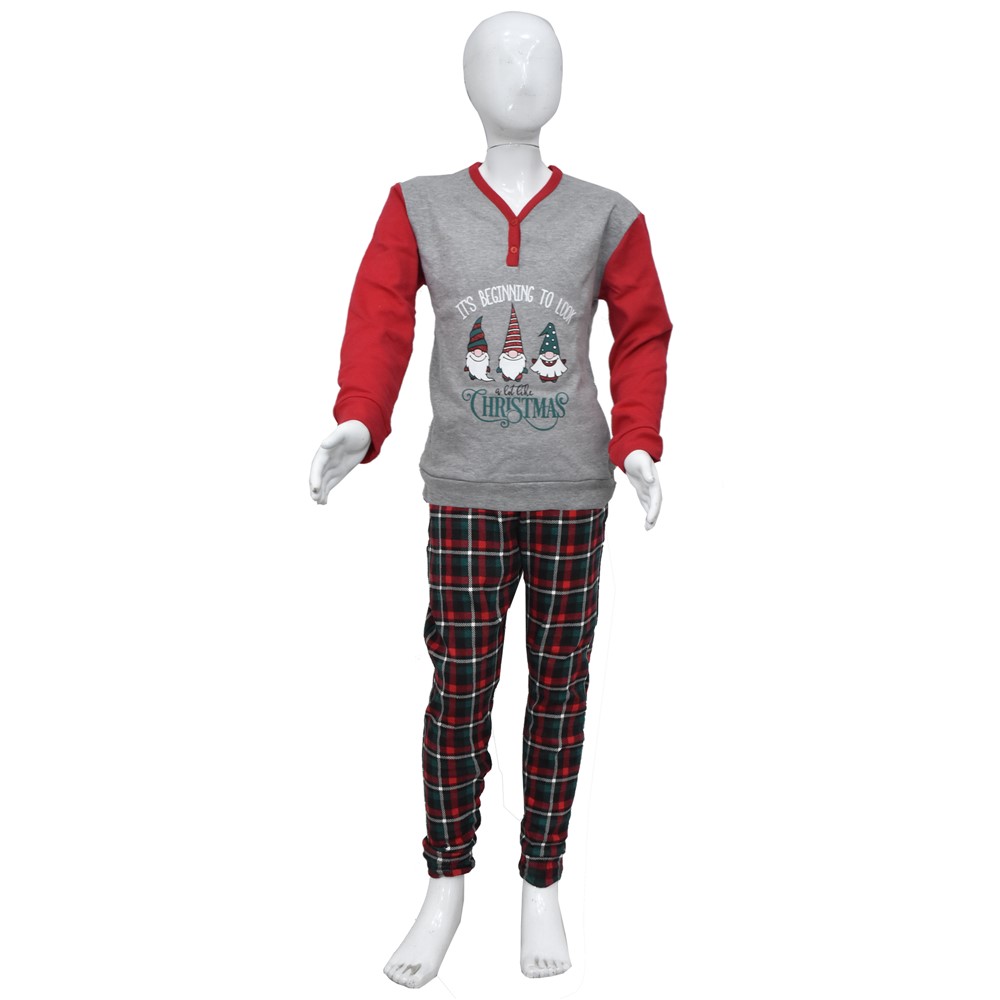 Pajamas for kids, made of 65% polyester and 35% cotton, with hypoallergenic and antibacterial properties, which do not cause skin irritation, absorb excess moisture, are hygienic and have regulating properties of body temperature and heart rate. The pajamas include a round-necked, long-sleeved blouse, and a pair of long-sleeved pants.