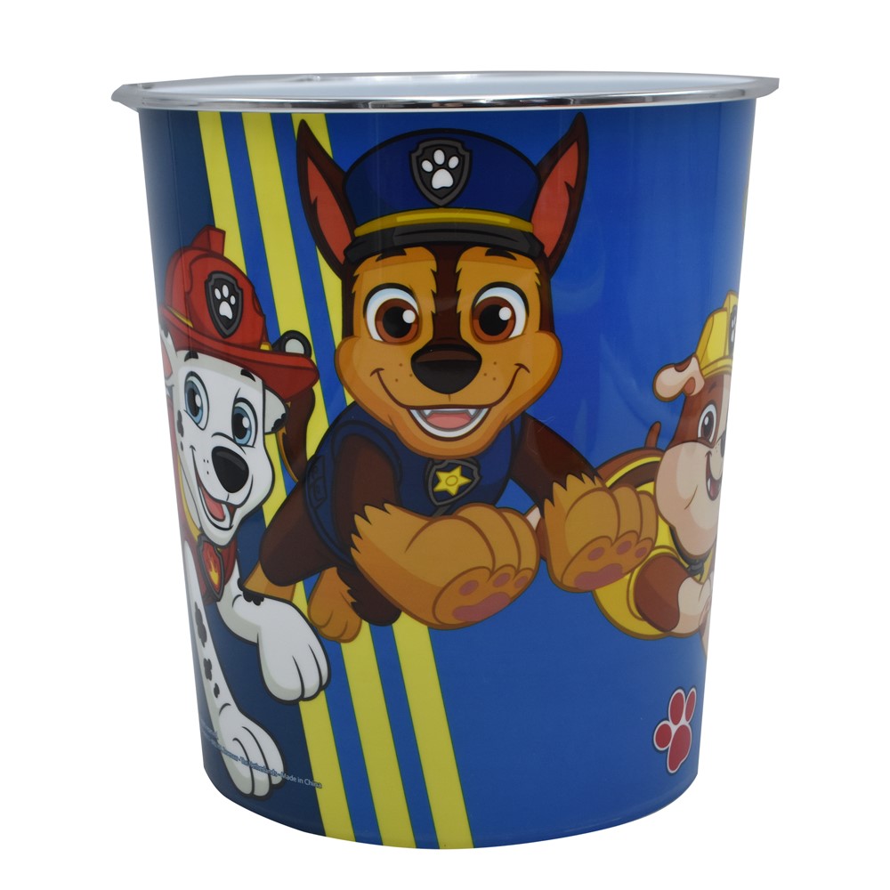 Paper bin for kids, made of metal material, in a round shape, with Paw Patrol design. The paper bin is used in children's rooms, to help organize and keep the interior environment clean.