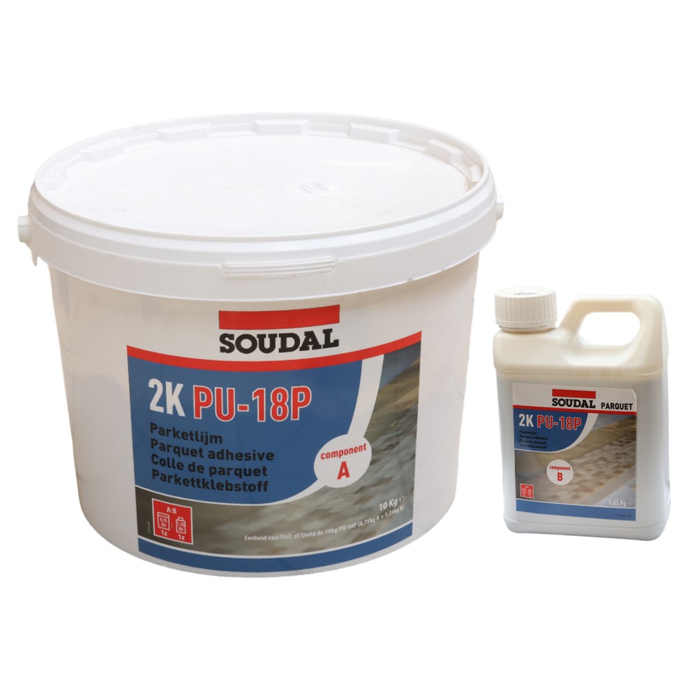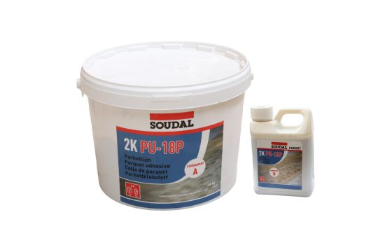Permanent Polyurethane adhesive for parquet, wood by-products, and heating substrates. The adhesive provides maximum stability and durability. Mounting with this adhesive is simple using the following: Allow PU-18P to reach room temperature before use. Add all of component B to the bucket of component A. Mix the two components very carefully using a mixer and beat for at least 2 minutes to get a homogeneous mixture. Always mix one package at the same time (A-component + B-component). Any deviation from this mixing ratio is detrimental to the strength of the adhesive and the final mechanical properties. PU-18P must be used within 50 minutes after mixing the two components. Use the Soudal B11 trowel. For parquet sizes smaller than 60x300 mm, use the Soudal B3 trowel. Do not apply more adhesive on the surface than the part that can be closed with parquet for approximately 60 minutes. Place the parquet on the adhesive with a sliding motion and tap with a rubber mallet. Ensure a good transfer of the adhesive to the parquet (min. 80% coverage). If necessary, weigh the laid parquet. After at least 24 hours, the parquet can be smoothed and treated.