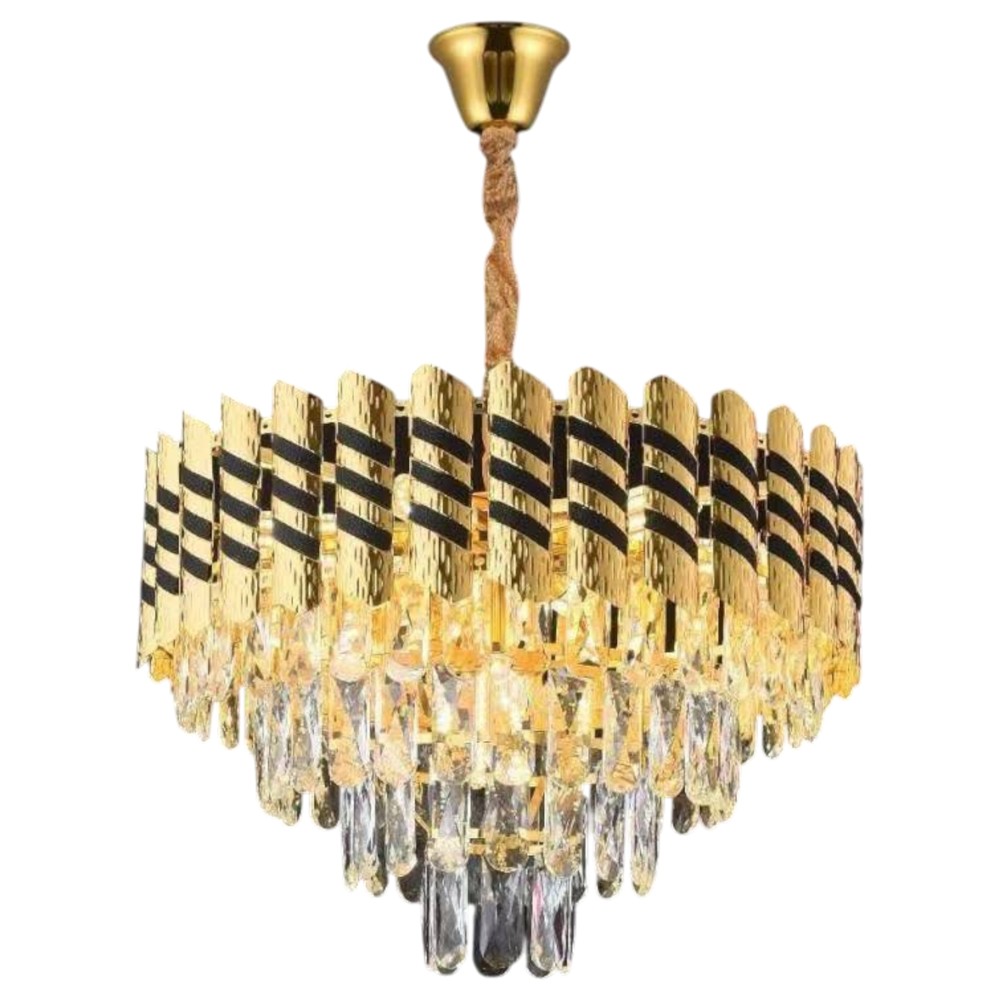 Pendant lamp with 9 E14 light sources, diameter 60 cm. Elegant design made of metal and crystal in gold color. Suitable for living rooms, dining rooms and luxurious interiors.