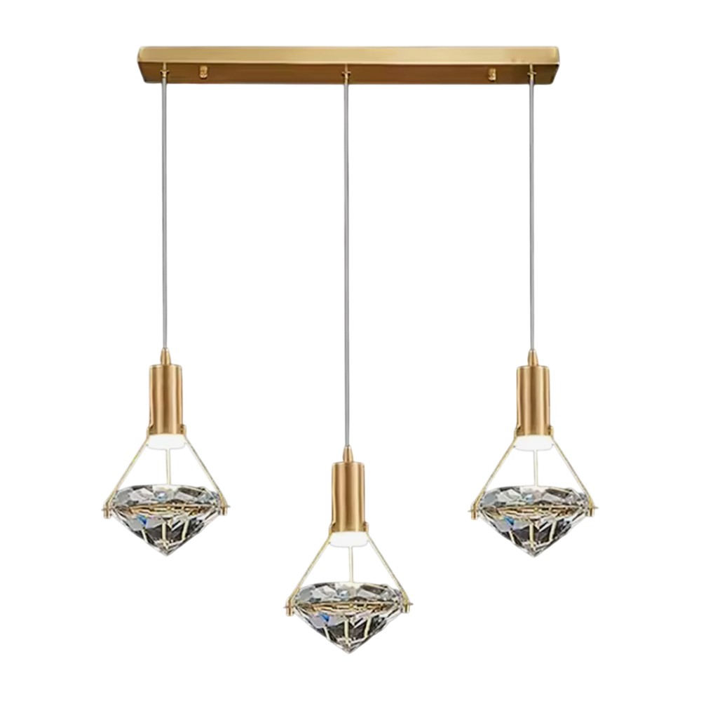 Pendant light with 3 GU10 bulbs, 56 cm long. Made of metal and crystal with a gold finish, it offers decorative lighting and elegant design for modern environments.