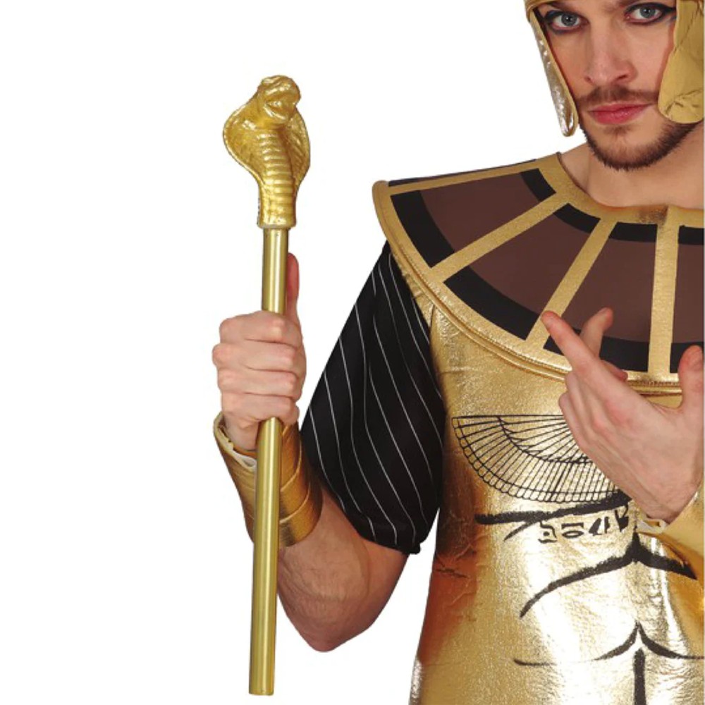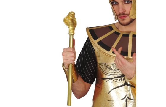 Pharaoh's scepter, made of plastic material, with dimensions of 47 cm, in golden color. It is used as an accessory for different Halloween or carnival outfits.
