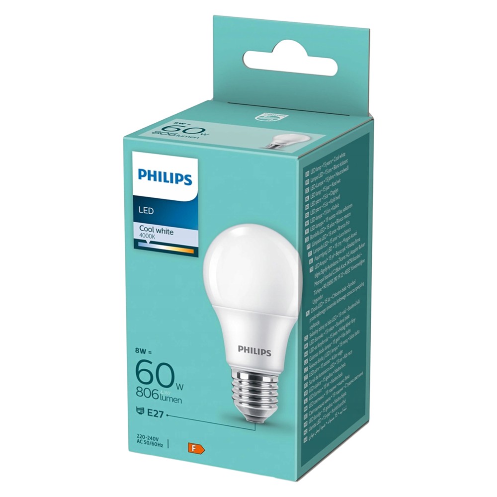 Philips E27 standard base LED bulb that provides powerful 806 lumens of light with a light temperature of 4000 K (neutral color). Consumes only 7.5 W of electricity, replacing a traditional 60 W bulb with energy savings of up to ~80%, turns on instantly, and has a long lifespan. Not dimmable