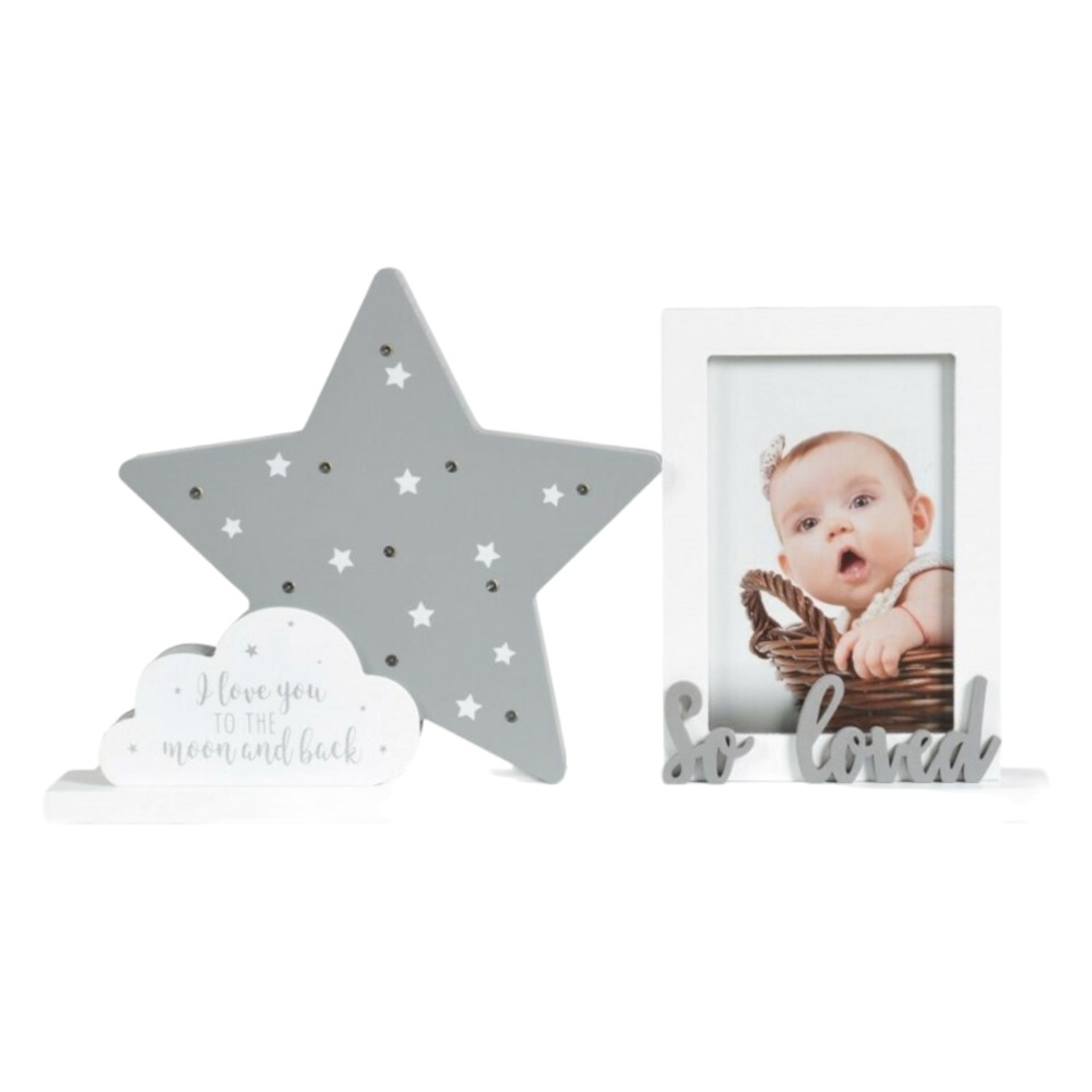Photo frame for children, by Cangaroo. The frame is made of wood material in a size of 8x37x21 cm. She has designed a star, a moon, and the space for placing the photo.