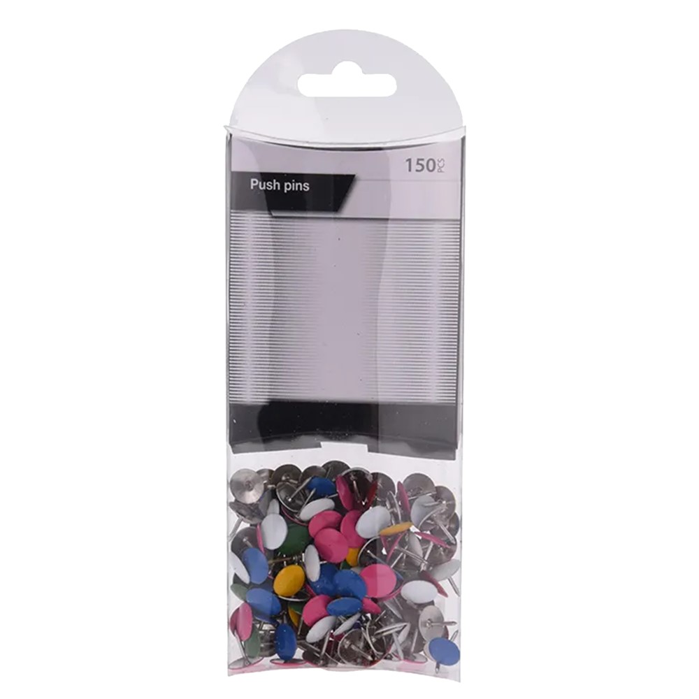 Pack of 150 drawing pins. perfect for pinning notes on the appropriate cork board or for crafting. Assorted colors.