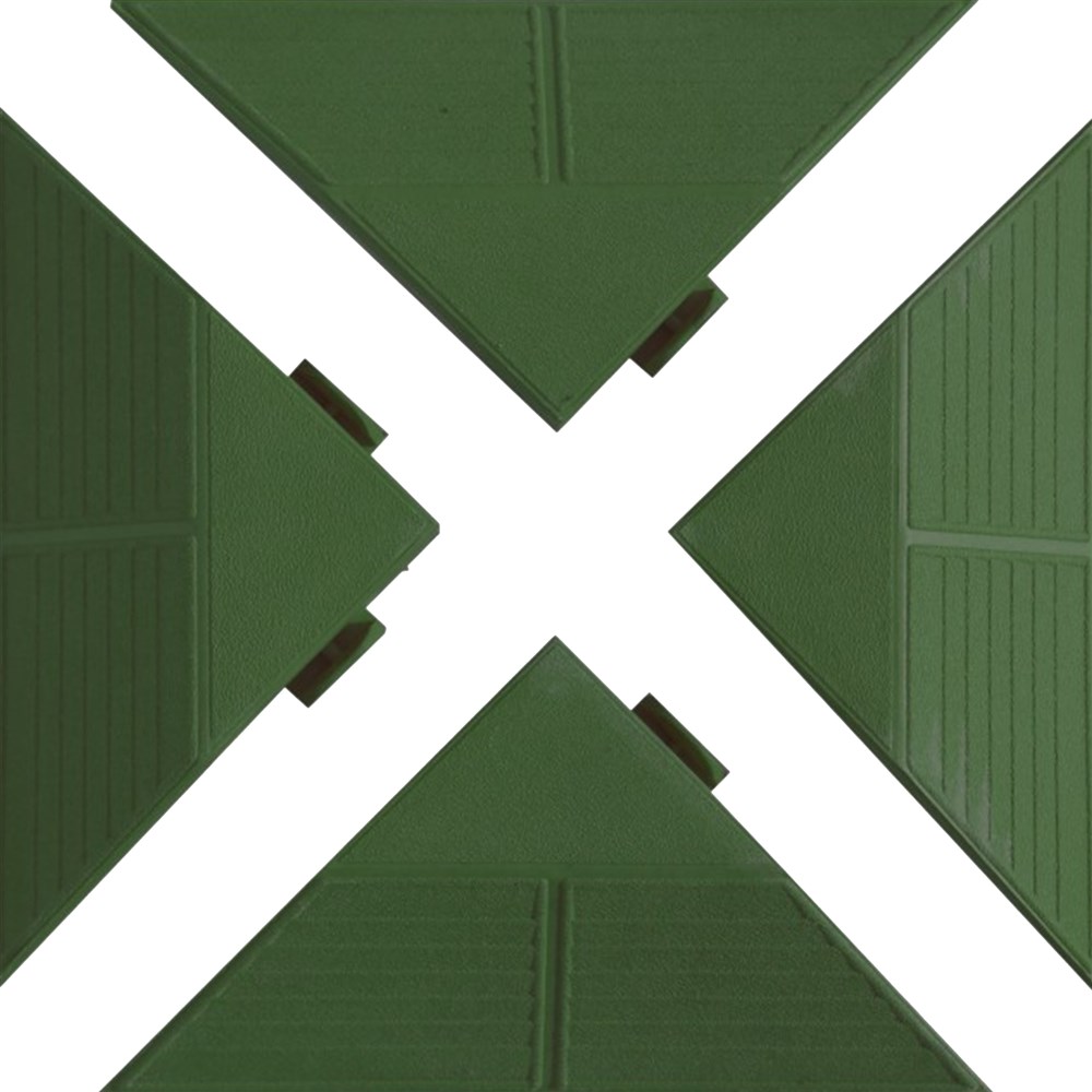 These floor tiles and their finishing elements are fit for gardens, campings, stands and gazebos, swimming pools, walkways and greenhouses. Easy to assemble, can be mounted and demounted quickly and easily. They are weatherproof and resistant to oil and solvents. Thanks to the side hooks you can linked one the others in a staggered way, to obtain different geometric designs. They are made of polypropylene with calcium carbonate to give the product the right stiffness.
