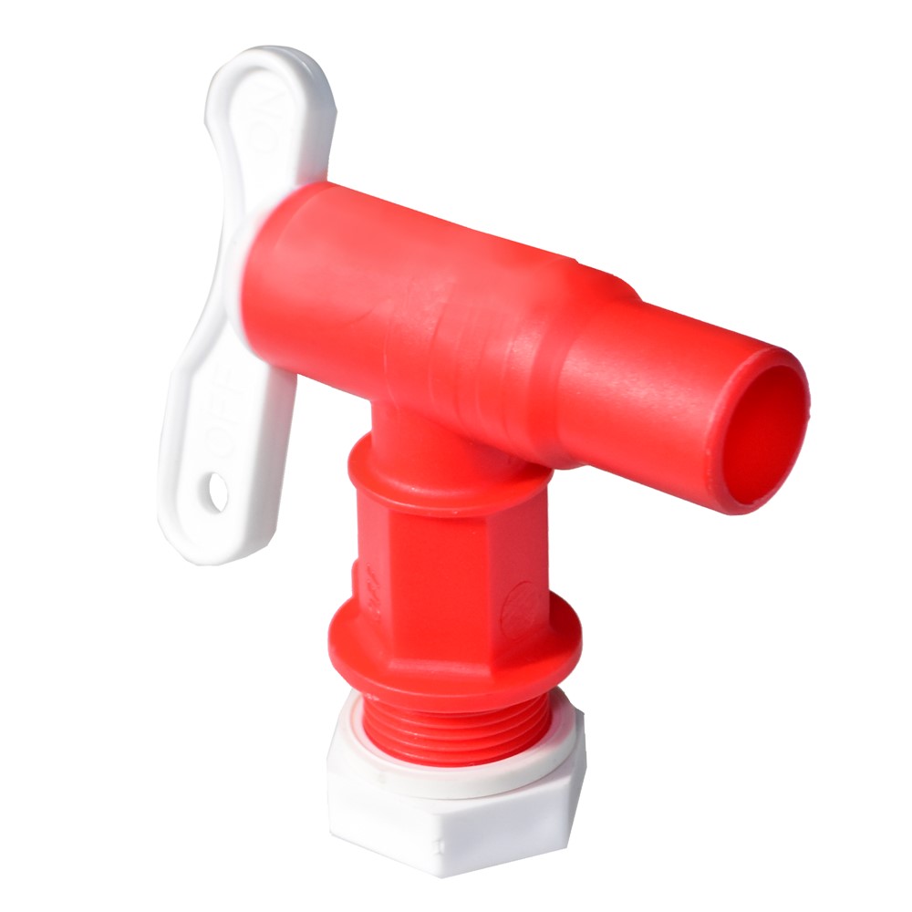 Faucet 3/4 " with nut, made of plastic material, in red color. Used to be placed in cans with the same opening of 3/4 '' for the transfer of liquids from the can to the container.