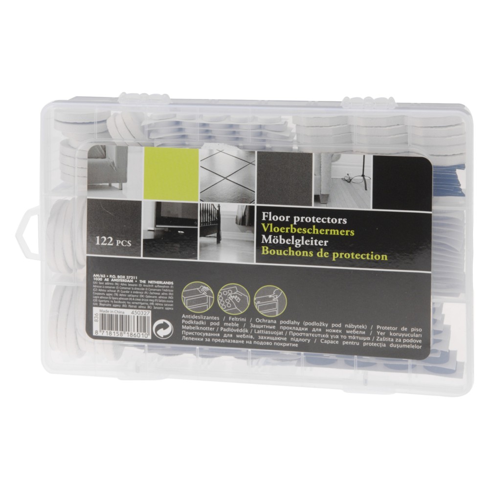 Furniture floor protection adhesive that helps prevent scratches and minor damage to the floor. The set includes protectors of different sizes