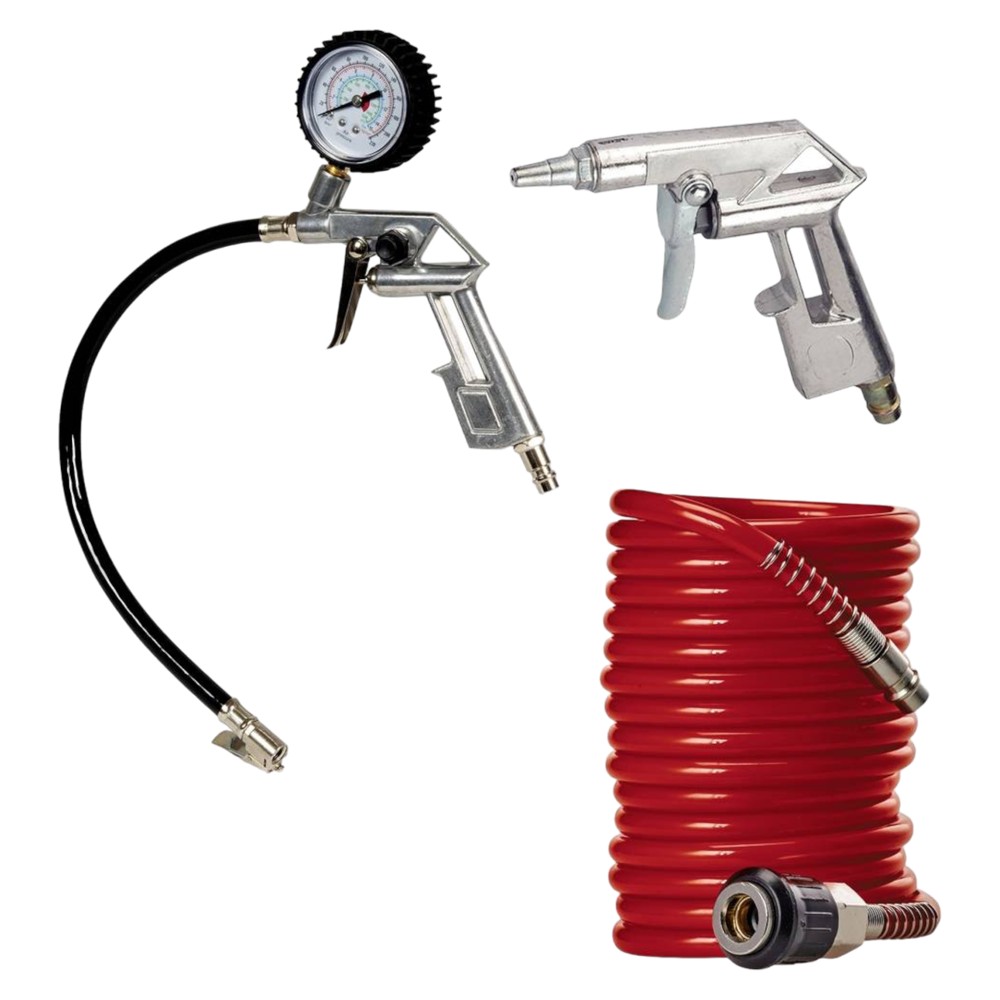 Ideal set for cleaning the mechanisms and at the same time inflating the tires of cars, motorcycles or trucks. The guns are accompanied by a 5 m air tube.