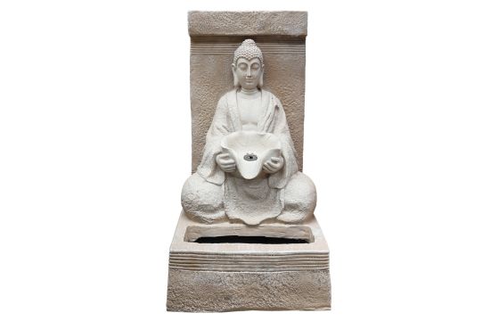 Polyresin fountain "Budha", W/ONE LED with water pump 10m cable. Product size:30x33x51cm. They have the appearance of natural stone. To add a relaxing and beautiful element to your surroundings and to bring nature near you, this fountain is the solution. They can be placed inside or outside.