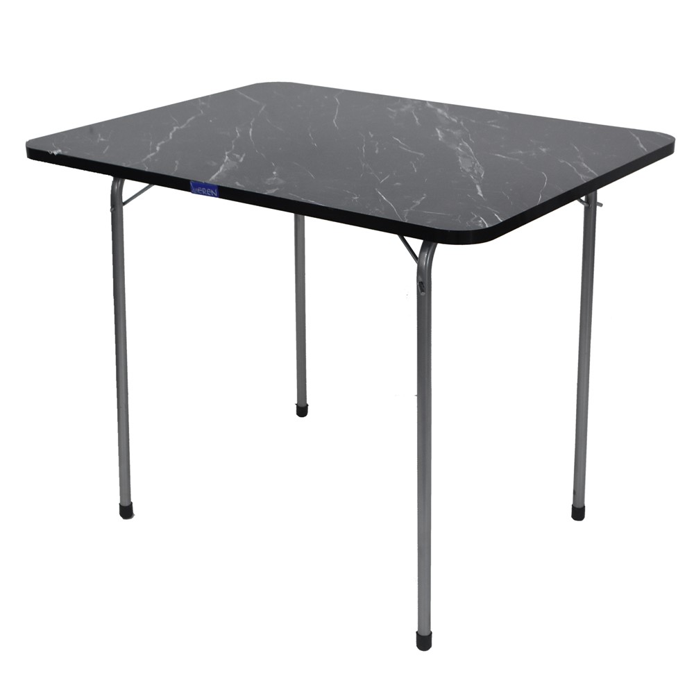 Portable camping table, with a stable support structure, made of metal material, with dimensions of 60x80 cm. The table surface is made of pressed wood material, in black color. It can be used on camping trips, picnics or on the beach and can be easily transported thanks to its compact dimensions.