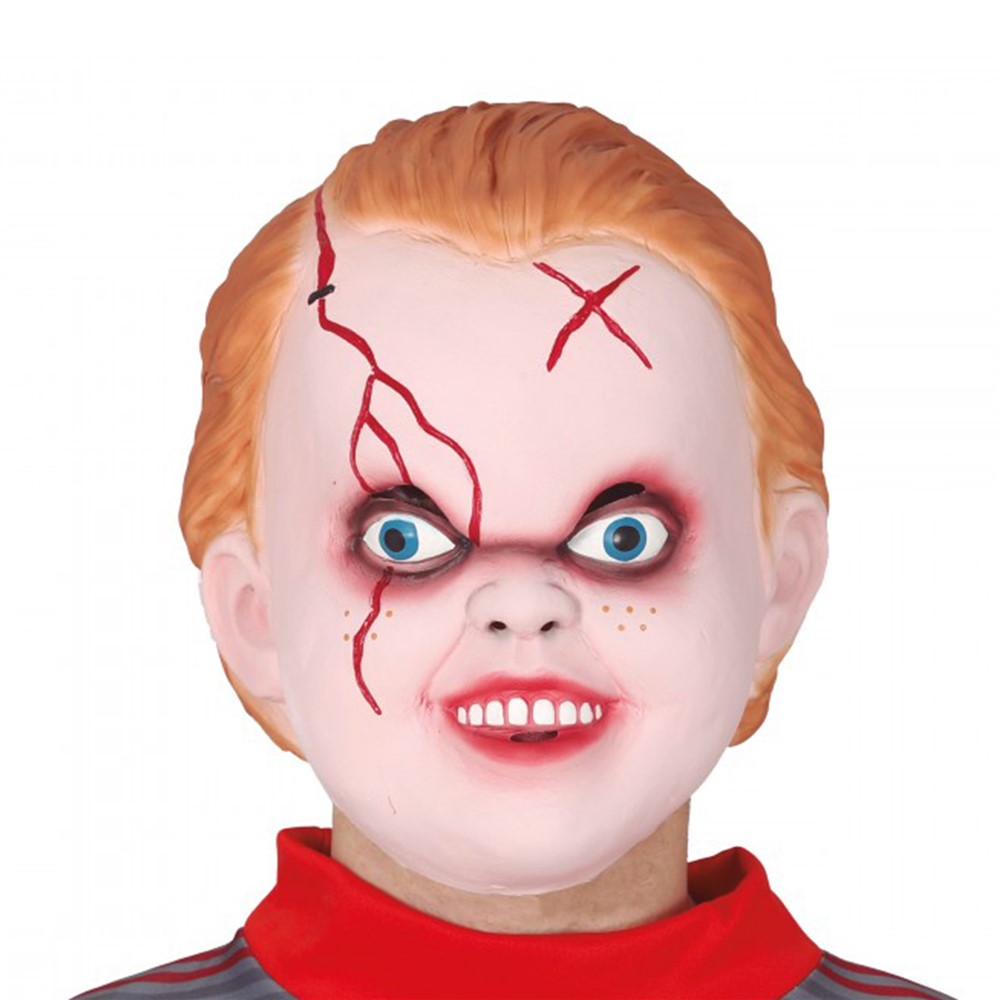 Mask for halloween, made of latex material, one-sized, in red and orange. The mask is based on Chucky from the horror film Child's Play. The mask is Ideal to wear during Halloween carnival or at a fancy costume party.