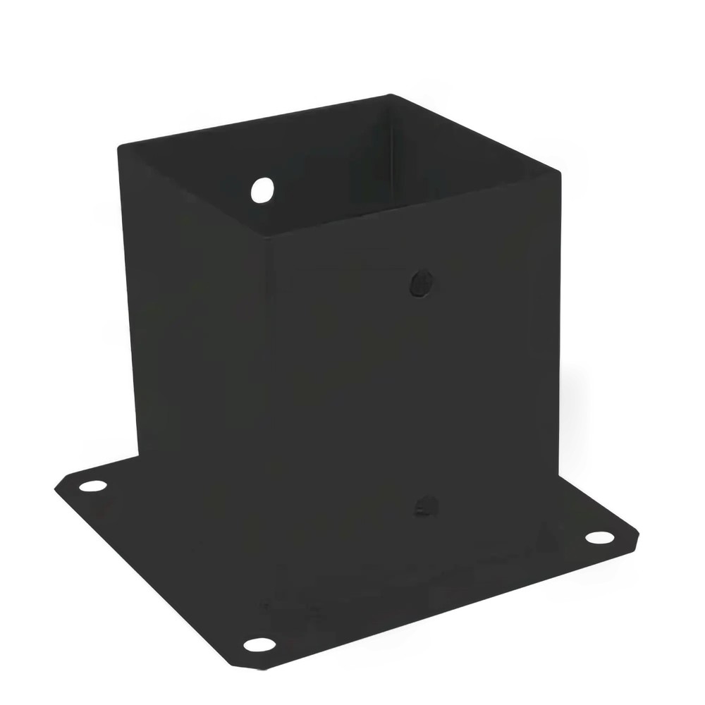 Rail holder, made of metal material, with dimensions 101x150x2 mm, in black color. It is used to facilitate the assembly of wooden elements with concrete surfaces, ensuring a stable installation of the wood on the base. The component material is resistant to use, heavy weights, rust or corrosion. It can be easily installed using screws.