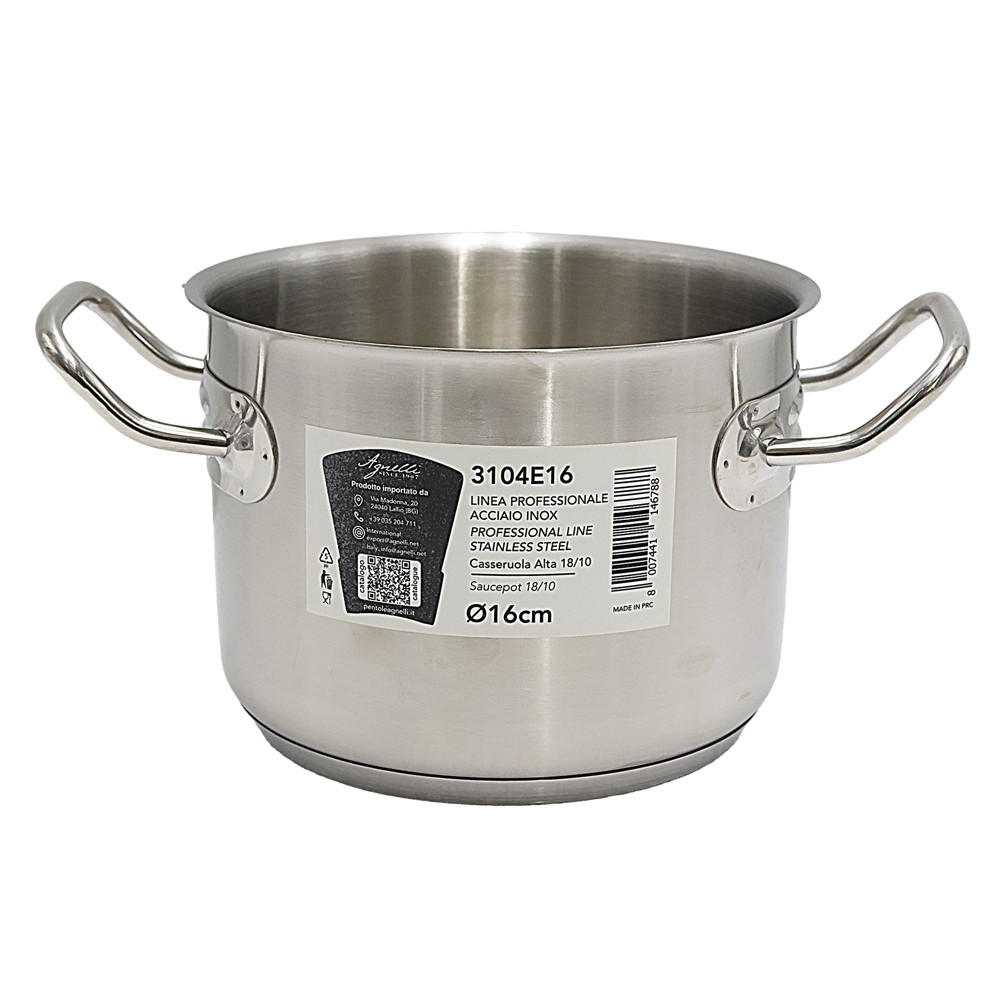 This premium Agnelli saucepan is designed for everyday cooking with high performance and guaranteed durability. Made from high-quality stainless steel, it offers resistance to scratches, high temperatures, and food acidity, while maintaining its silver shine even after frequent use. The sturdy side handles ensure a secure grip and easy handling in the kitchen, while the 2.1-liter capacity makes it suitable for boiling, soups, sauces, or small family meals. With a diameter of 16 cm and a height of 10.5 cm, it allows for even heat distribution, delivering optimal results in every cooking session. An ideal choice for professional and home kitchens seeking performance, elegance, and durability.