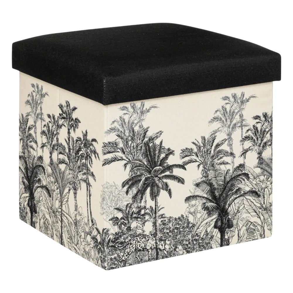 White sofa with black details and tropical design. It is made of polyester fabric and mdf. The interior filling is made of polyurethane foam. At the bottom there is a storage space ideal for placing small items. Ideal sofa that will provide an extra place in your space and a place to hide things.