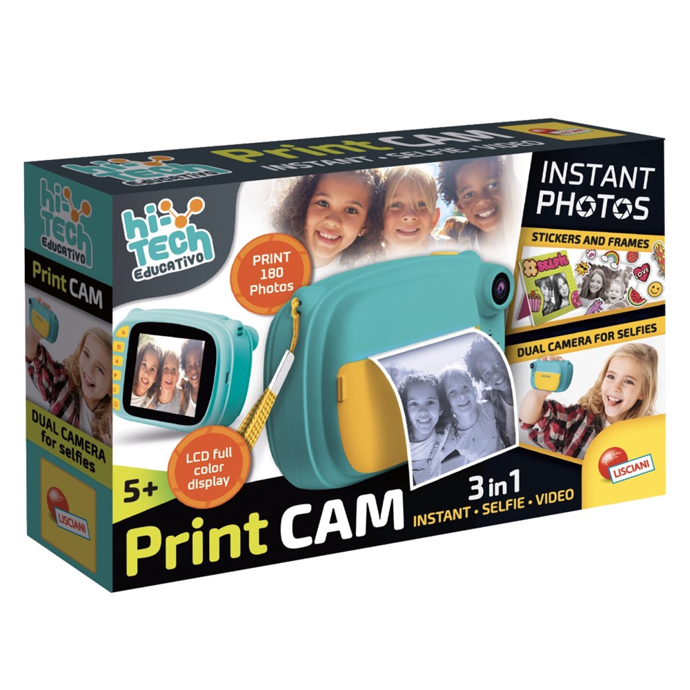 An instant camera to create and print photos with fun effects. Very easy to use. You can make videos and collect and share photos with your friends. You can take selfies thanks to the dual camera. With fantastic frames. You can also make a collection of all your photos. With 10 frames with fun effects. Create some fun effects and print instantly. Camera: 3 rolls for 180 photos, strap to hang your camera, 10 cardboard frames, sticker sheet, user manual, charger.
