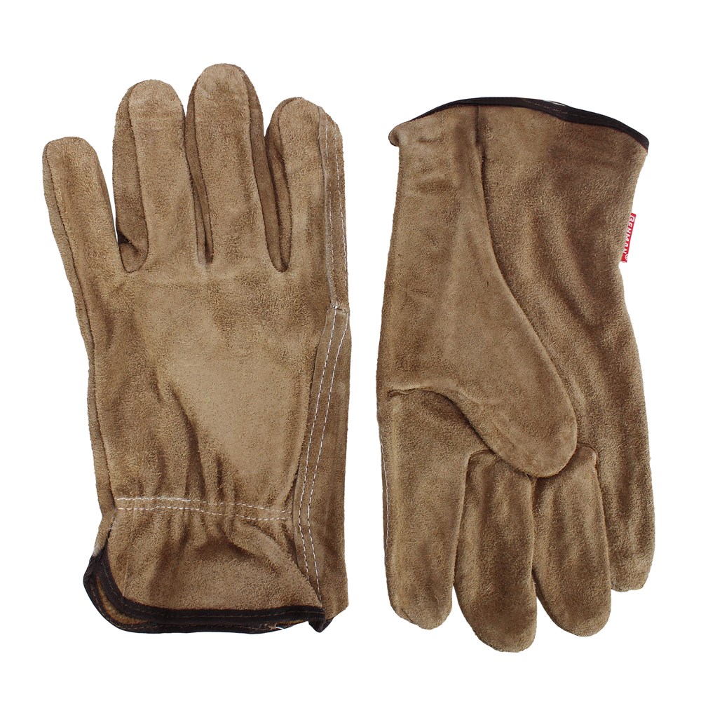 Work gloves manufactured from a highly resistant leather material, widely used in construction, gardening or other environments where there is a need for the use of hand tools. Their thickness makes it possible comfort and do damage during use.for general use • Cow split leather glove, full leather, wing thumb, unlined, with extremely resistant seams • Glove length 25 cm
