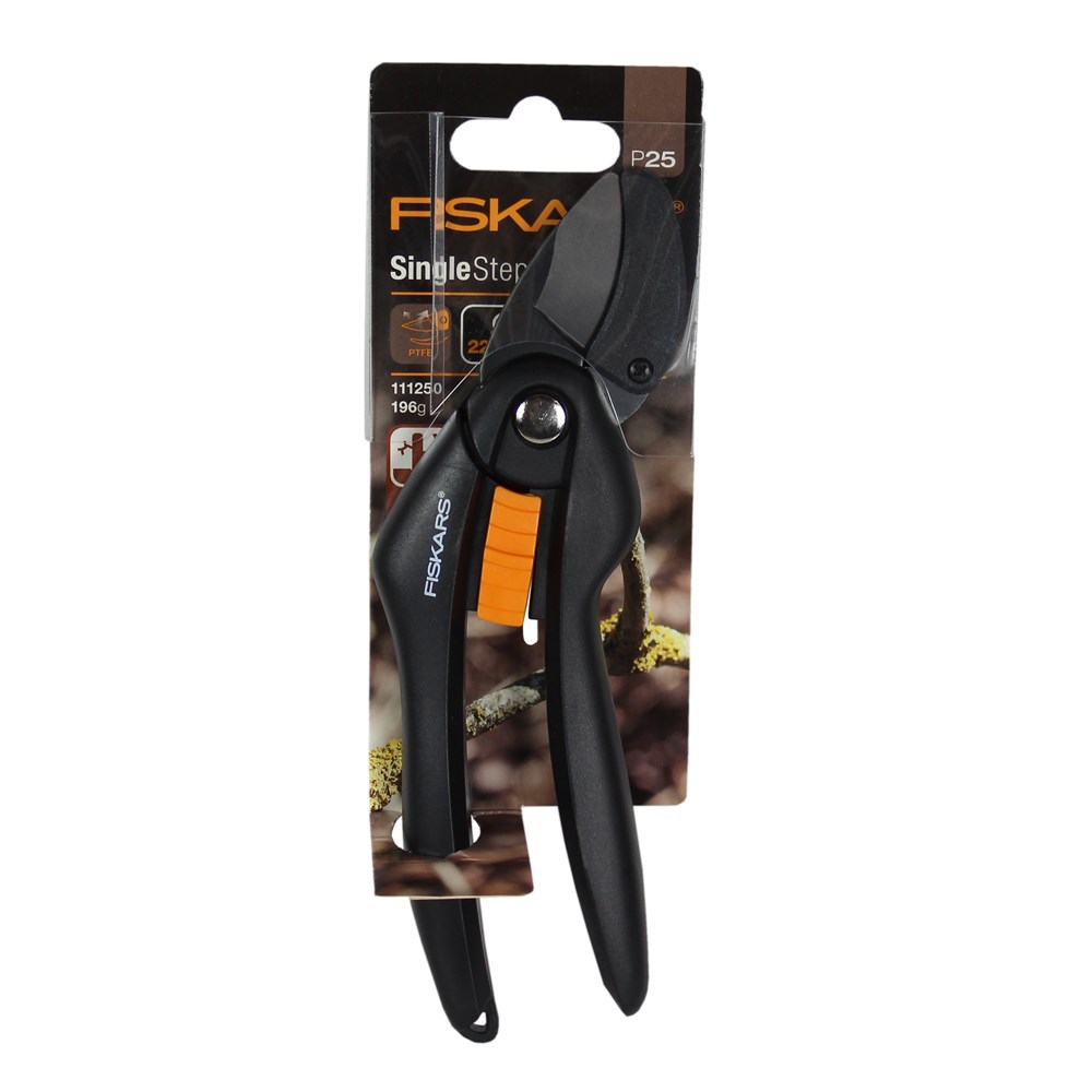 Fiskars SingleStep™ Anvil P25 pruner is a neat and simple pruner for cutting hard wood. The robust single step mechanism will not let you down when you are pruning bushes or trees or whatever you need to trim back in the garden. Look no further if you are seeking Fiskars quality for basic pruning tasks in the garden. Enjoy the SingleStep pruner's Sturdy handles for a comfortable grip and their well balanced design for a steady cutting action. Their non stick PTFE coating on the carbon steel upper blade reduces friction and make cutting and cleaning easier as polyamide. The cutting capacity of 22mm is more than ample for most cutting tasks so get out there and cut some trees, bushes and flowers