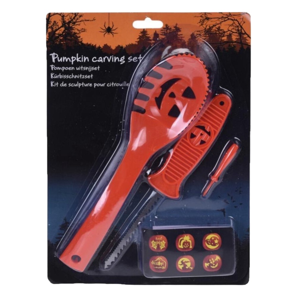 Pumpkin cleaner, made of plastic and stainless steel in orange color. This cleaner is used for Halloween pumpkin decorations. The package contains a spoon, a serrated knife, a mini skewer, and a pumpkin decoration guide.