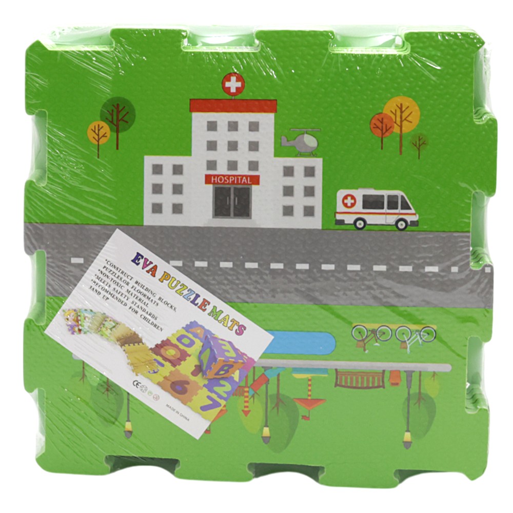Puzzle mat for children. With a city design and attractive green color, children can build roads, houses and other imaginary spaces, stimulating creativity, logic and hand-eye coordination. Each piece has a dimension of 30x30 cm and can be used as a durable mat for individual or group games. The safe and soft material makes it suitable for any indoor environment.