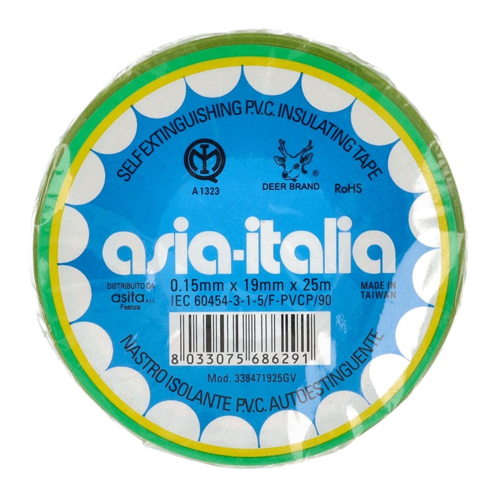 Insulating tape, dimensions 19 mm x 25 m x 0.15 mm, yellow/green. Flexible and voltage-resistant material, suitable for insulating cables and electrical connections. Provides safe protection and durability in long-term use.