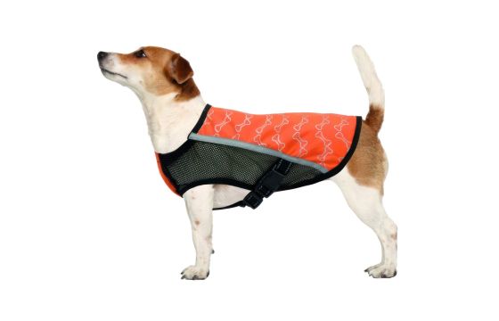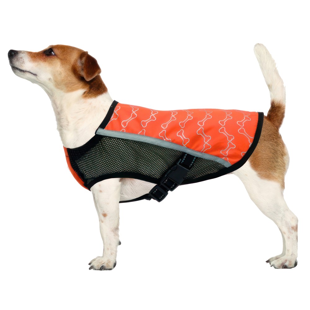 Lightweight raincoat in technical fabric, reflective print and drawstring to adjust the width of the neck. Reflective contrast border. Opening with zip for the collar and elastic bands for the hind legs.