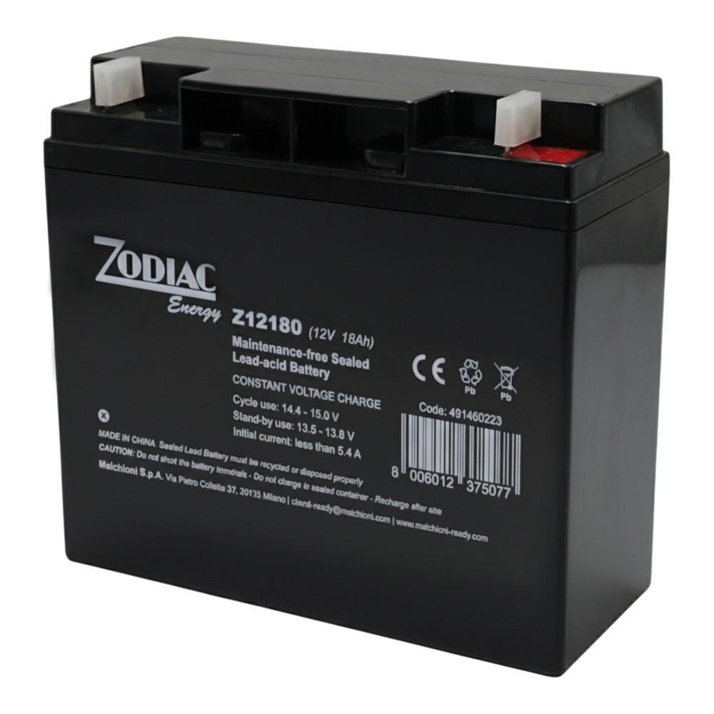 Rechargeable lead battery 12V 18Ah connections T3 ZODIAC. VRLA AGM hermetic battery gas recombination technology, with 99% of internal gases recombined, can be used for both buffer and cyclic use. The battery can be installed inside electronic equipment or in any environment.