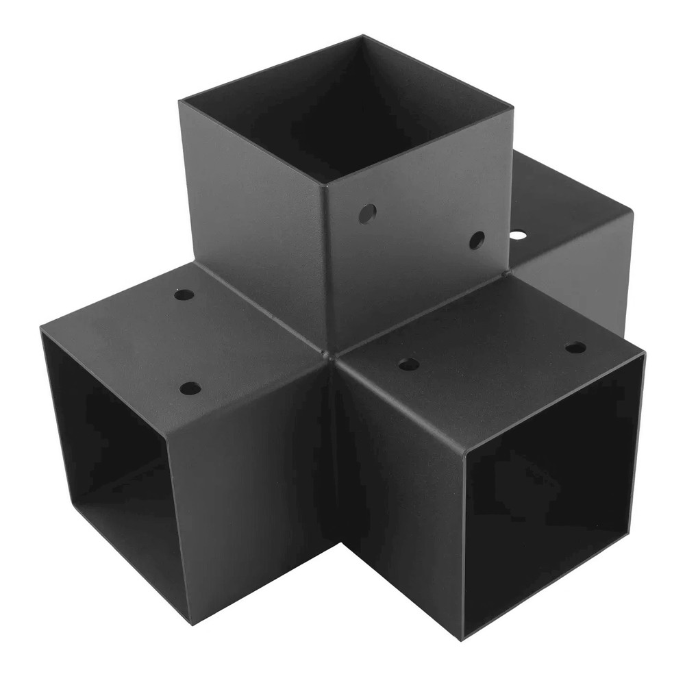 Reinforced corner wooden connector, made of galvanized steel material, painted in black, which protects it against corrosion and rust. It is used to enable a better connection of the wooden elements to each other or the wooden elements to the walls and the floor. This product is suitable for use in both standard systems and individually designed connectors.