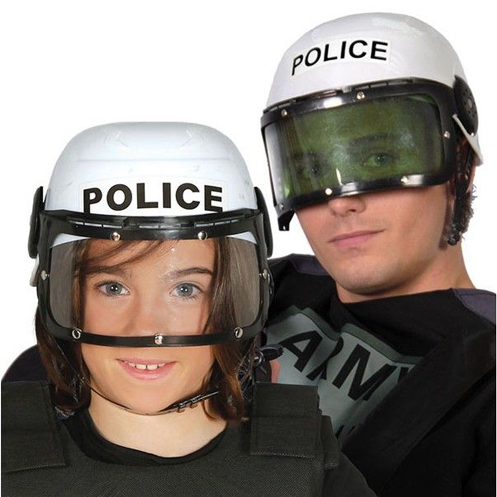 Helmet, police made of plastic material, in white color. It serves as a head shield with a police design and such inscription. Ideal to complement the police theme, for Halloween costumes, or for birthdays.