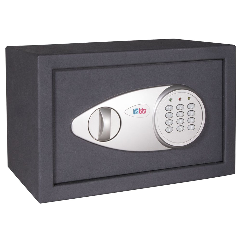 ALPHA BTV safe for home and office, safe and elegant, with a door thickness of 4 mm and a body thickness of 1.5 mm. Black color with dimensions 200 x 310 x 200mm, opening method with key and electronic, an 8-digit emergency code. The weight of the safe is 6 kg and the internal capacity is 8 Lt.