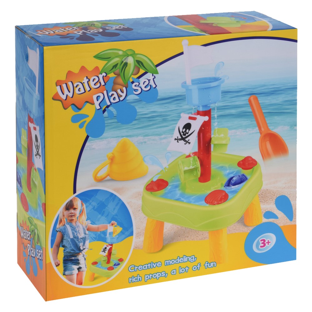 Messing around with water and this pirate water play table. Pour the water into the mast and watch the watermills start spinning. The water table comes with 2 boats, watering can in the shape of a shell, shovel, rake, pirate flag and 4 different sand shapes. For hours of water and play fun!