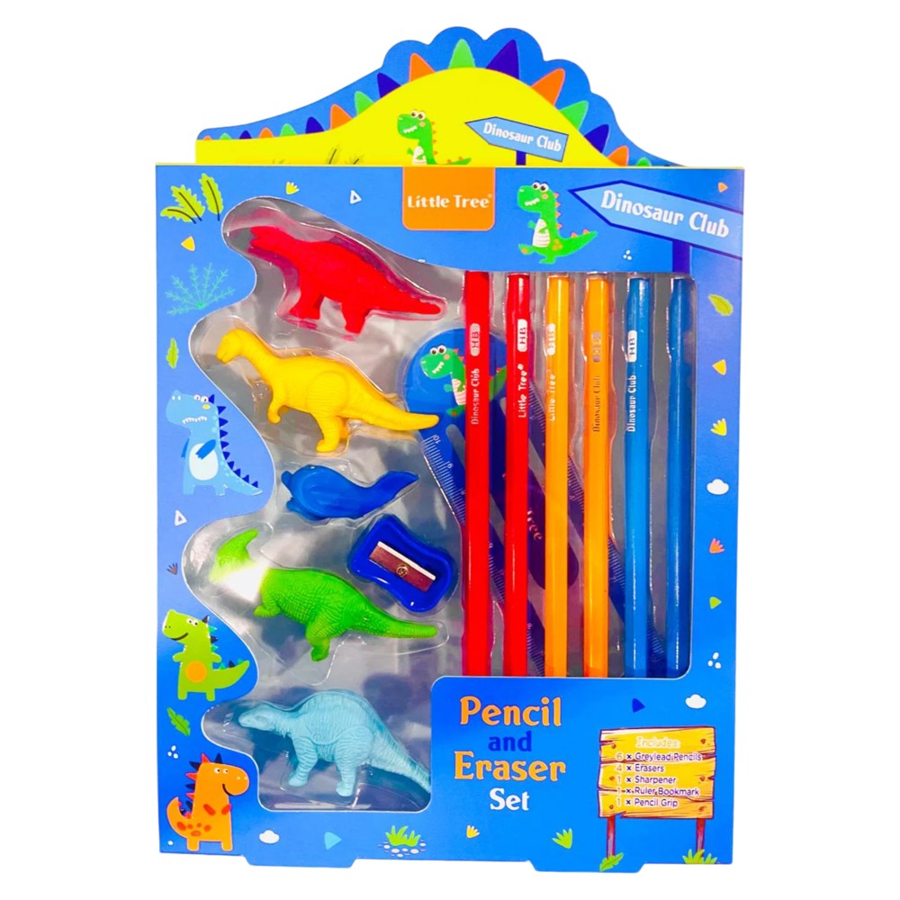 Dino school set, including pencils and erasers. This dinosaur design and mixed color set is ideal for children, offering pencils and erasers in a fun and attractive package.