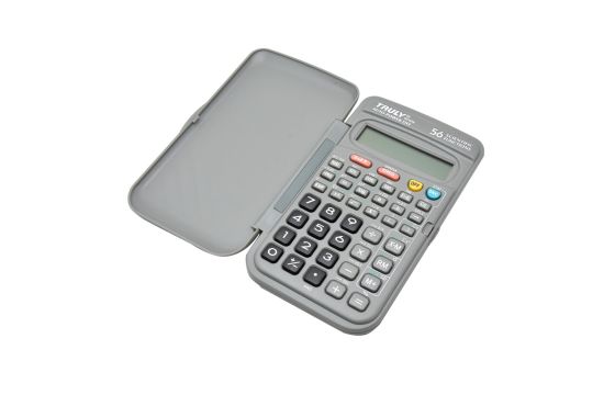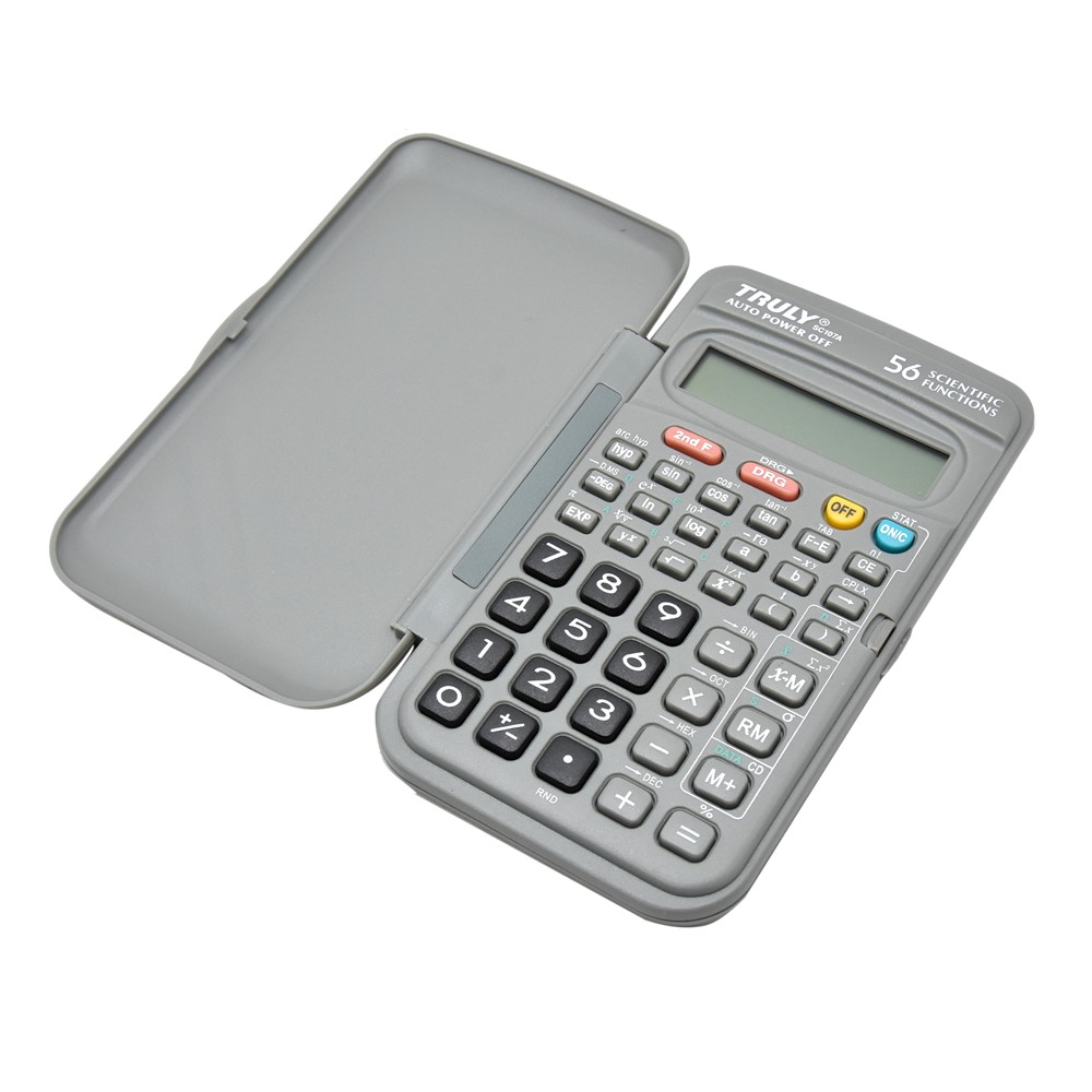 Scientific calculator, model SC107A, with 56 scientific functions and 10 digits display, made of plastic material, in gray color. It operates with lithium batteries, it is equipped with a folding lid and has compact dimensions which make it practical to use. This product is suitable for use by pupils and students.