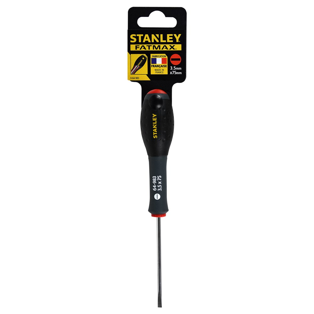The Stanley FatMax 0-64-983 Screwdriver with with suspension eye has a chrome vanadium steel bar shaft which allows high torque and reduces the risk of tip breakage. The handle is moulded directly to shaft for a virtually unbreakable bond giving long life and durability. The soft-grip handle gives a perfect combination of great grip and reduced fatigue in use and is colour coded for easy identification of the right tip type for the application. The smooth domed end offers fast, comfortable spinning action and the large diameter handle offers higher torque when driving wood screws.