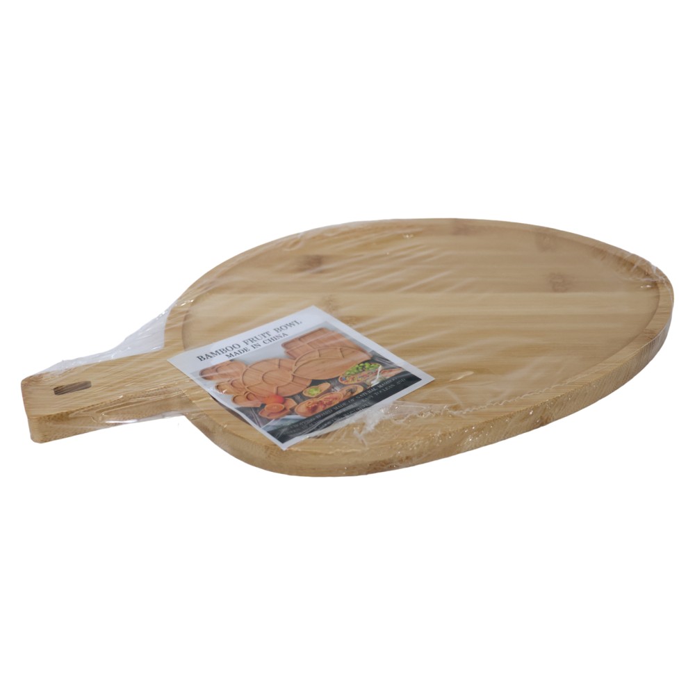 Bamboo serving tray in natural brown color, diameter 34x21 cm. This product is ideal for presenting different foods in an organized manner.