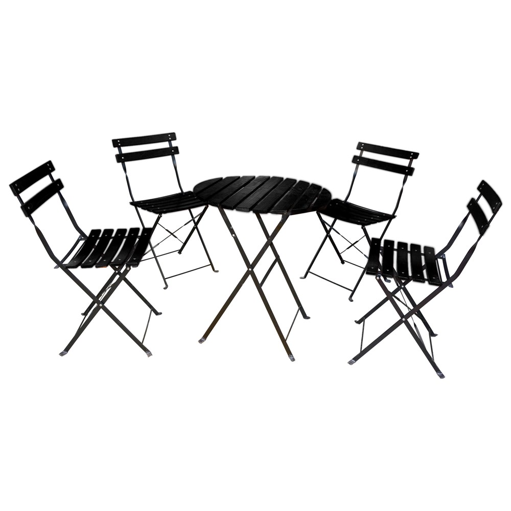 Set 4 Foldable Chair (Without armrest; Metalic Frame Frame) + 1 Foldable Round Table (Metalic Frame Frame), Size: Chair: 42x35x79cm; Table: D.60 x70cm, Color: Black, Material: Wooden+Metalic Frame
